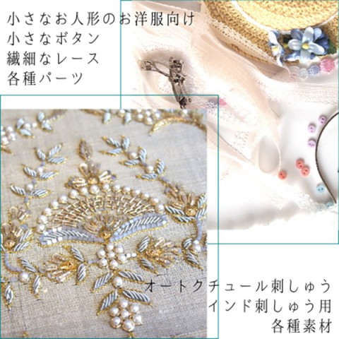 また、リカちゃんやブライス・ねんどろいどなど小さなドールサイズのミニチュアボタンやバックル、小物づくり用のパーツ類、細幅のレースやリボンを多く揃えています。