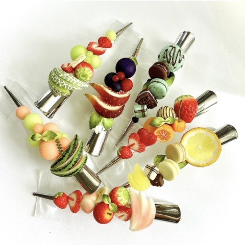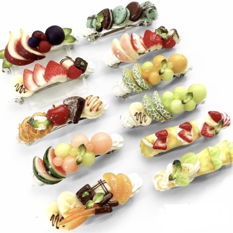 様々な粘土の配合を調整しながらフルーツの瑞々しい果肉感や皮の素材感などを表現。またフルーツの断面や複雑な皮の配色は1枚1枚丁寧に着色しリアルに作っています。