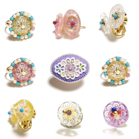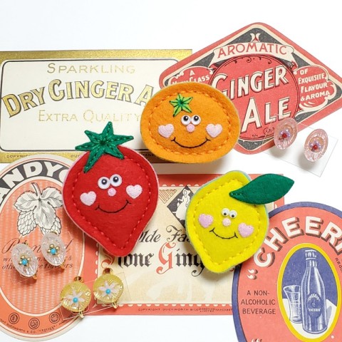 毛糸作品・フェルト作品・木工作品、昔から好きで集めていますアンティーク、ヴィンテージのボタン・紙もの・玩具・食器と組み合わせて展示・販売しております。
