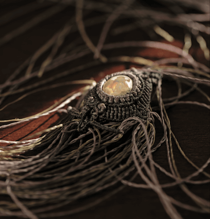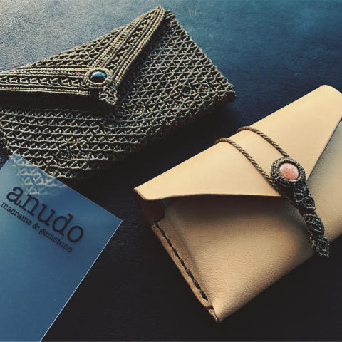 海外の採掘地を訪れ、自らの手で採掘・買い付けた天然石と、100色以上の多彩な色のロウ引き紐を使用した作品を展開。